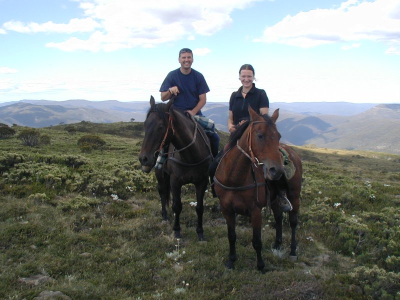 | 7:30am Breakfast(Eggs, Sausage, etc). No tent to pack up...Yea! Almost no soreness...Big YEA!! Saddle up and leave at 10am. Today was steep uphill almost all morning and I learned to balance well standing out of the saddle and leaning forward over the horse. The calves got a little sore after awhile, but not bad at all. Had a nice lunch and rode to camp...Stoney's Hut. We had a nice break. I was surprised how many people set up tents when we had bunks in the hut to sleep in. Georgie and I took the penthouse and we were the only ones who slept upstairs. After a nice relaxing break we took a ride to The Bluff. It was totally gorgeous...360 degree views of the valleys below and the the surrounding mountains. I took lots of pictures. We rode back to camp, washed the horses, had a delicious roast lamb dinner with all the fixings. Tonight was joke night around the fire. We went around circle and everyone had to tell a joke(though a couple passed). After the first round, a few of us kept it going for a long time. It was so much fun. In this age of email jokes, it was good to get in some real old-fashioned outloud jokes. Somehow we bargained and actually ended up with 4 1/2 beers each. And again I was pleased that I had almost no soreness! |