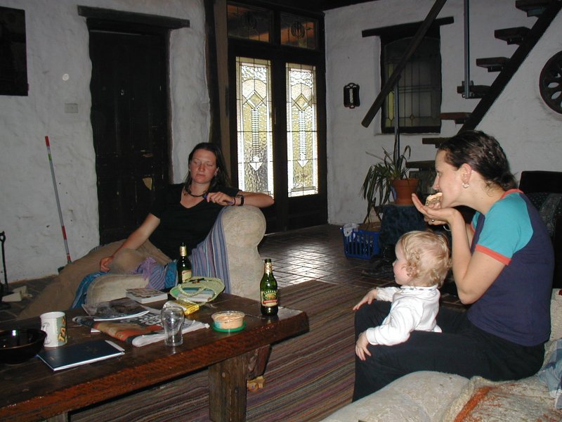 I had a quick stop in New Zealand to switch planes. On the flight to New Zealand, I had the light breakfast, since I had just eaten on the other plane. The movie was K-Pax, which I'd seen in the theater, but watched to pass the time. It was dark and rainy outside when we landed. The Aukland airport is the nicest large airport I've seen. They have shower stalls in the bathroom! As we landed in Melbourne, there were thick clouds and it was lightly sprinkling on the ground. I couldn't see Melbourne from above because of the clouds, but the very first thing I saw as we descended through the clouds broke were the Golden Arches of McDonald's. I found that fairly amusing. Before we landed, they gave us customs cards to fill out and they played a video which stressed the heavy fines for giving false information. First the ask if you have ANY food. I have a pound bag of M&Ms and a couple granola bars. Then they ask about hiking/camping gear. Well, I figure my sleeping bag is pretty obvious as it's attached to the outside of my backpacking pack...and I have my hiking boots inside. I decided to conveniently miss the part about about the hiking gear, but I note that I have some M&Ms. Once in customs, I ask the guy about the M&Ms, offering to throw them away if that will help. But I was sent to the "Red Line"...thinking great, how long is this going to take...the line was VERY long! Fortunately I saw there was a guy checking on us in the line. I got his attention. He stamped me clear and I was sent on my way. I didn't even have to wait in the green line...so it really worked out for the best. As soon as I exited the customs area, Georgie was there waiting for me. It was so great to see her after 2 1/2 years since our chance meeting in Death Valley. We headed to her house in St. Andrew's. She warned me that it was a bit crazy at her house. That her friend Angie was in between moving and she and her two daughters were there...and another friend, Cerise was staying there. No worries, the more the merrier. St. Andrew's is a great little town...very small. We stopped at the General Store to pick up her mail on the way home. When I got there, I met everyone...making a very conscious effort to remember all the names. Angie and her daughters, Tally(3) & Sasha(1)...and Angie's dad, Doug. Cerise and her friend, Callin. We talked a bit and I tried vegemite. I'd heard about it so I wanted to see what it was like. It's a spread that goes on toast that is salty. Though not bad, I definitely decided it's an acquired taste. Then a few of us walked over to the "market", which is like a combination of a swap meet & and the Art Walk in Santa Barbara. There was a guy there who was a rock man...a slow moving statue and he put on a nice show. There was a music festival near by that evening and since I wasn't jet-lagging at all, we decided to go. Georgie rang a few friends to see if they were interested. Georgie and I went over to the music festival early. We ran into a friend of hers, Kaitlin, and her friend, Andrew. We watched a couple mediocre bands, then headed for home to meet up with the others before the band she really wanted to see played later that evening. Adam and Kathleen showed up and we headed back to the music festival. Things had really picked up. The music was better and the atmosphere was rockin'. A lot of people were dancing, kids and dogs were running around. "Those Bloody McKenna's" came on the were GREAT! I still am hoping to track down a copy of their CD. We went back to Georgie's and sat around talking for a long time, polishing off a slab(case) of Cascade beer. Out of all the the Australian beers I tried on my trip, Cascade was my favorite...though Boag's is a close second. Both are Tasmanian beers. It looked like Cascade was bottled for sale in the U.S., so I'm going to see if I can find some here. After only my first day, I could tell I was going to love it in Australia...and it just got better each day! |
