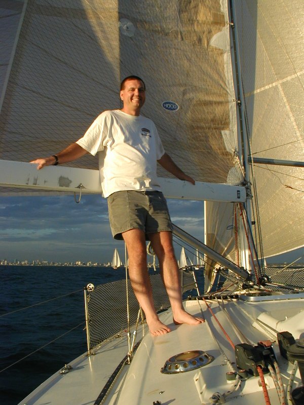 We needed to give Pip a ride to school and the van key couldn't be found. We thought Peter may have taken it with him the night before since he drove home. Later, I found out it was in Georgie's pants pocket. It was about that time that I became the keeper of the key. Georgie had some stuff to do, so I took a train into the city. I walked around a bit and did some souvenir shopping, highlighted by talking to the two blokes who worked in the sporting good store about sports. Then I caught the tram to St. Kilda to meet Georgie and to go for a sail. I got there a bit early and had several glasses of Cascade while waiting for Georgie at the Prince of Wales Hotel(Hotel=Pub in Australia). It was good, cold, and cheap...$1.90AUD. We walked over to the Yacht club and I met her Dad(Mel), Stepmom(Carol), and others. We were planning on going on her dad's boat, "Obsession"...but it had a dead battery and they were 100% sure if they'd have it fixed before the race started. We were invited to go out on the "Sea Eagle", so we opted for the sure deal. We sailed with Kevin and his nice crew. It was a fun race. Mostly Georgie and I were just ballast, switching from side to side as needed ducking the boom...but on the way back I was given the task of leaning into the boom. After the race we went back the yacht club for dinner and drinks. We found out that "Obsession" after swapping batteries came in 1st! I had a lot of fun talking to people. I talked to Mark, a friend of Mel's from his boat, for a long time...then the three of us talked for the rest of the evening. We went back to Georgie's Dad's to pick up a van to use the next day and then we went back to Georgie's Mom's. We hadn't planned on going back there that night, and Pip didn't take as kindly to be evicted from her sleep so I slept in the bed in her room. |