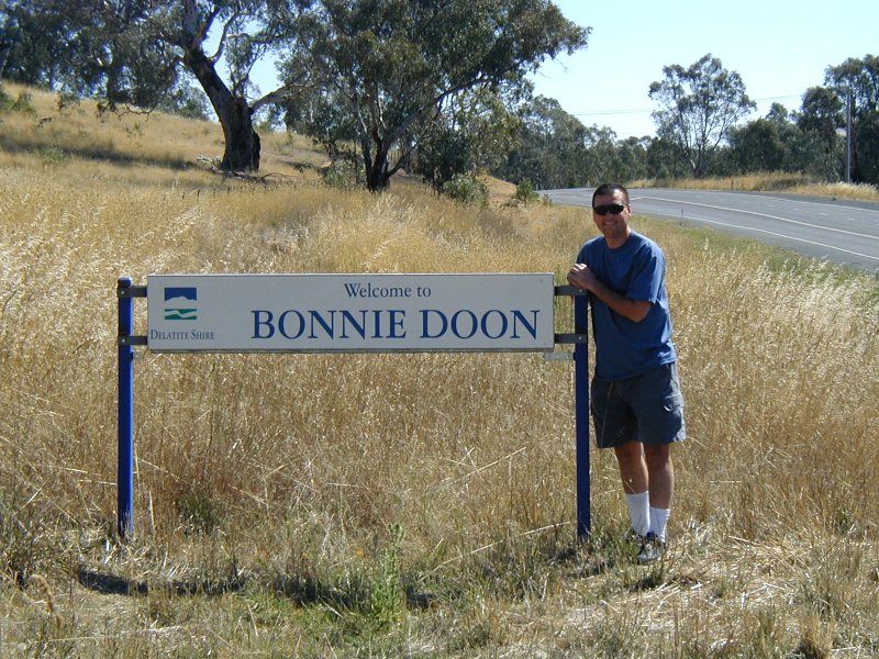 | Georgie and I packed up our stuff and headed out on our road trip. We passed through Bonnie Doon and stopped for the photo op below...then onto the little town of Mansfield, the last town we'd see for 3 days. We went to the park. Georgie took a nap and I wrote my first few postcards. Then we had a nice dinner at the Mansfield Hotel before driving up the hill. The road up was dusty and we had a 'roo hop in front of us and then later some wallabies. Once we arrived at Stockyard, we met two of the six staff...Cora(the cook, from The Netherlands) and Sarah(a rider, from England). They were both very nice. Jo and Carol, fellow riders were there when we got there and the rest trickled in through the evening...Neil & Courtney, Simone, Steve, Greg, Susan, Tom, Charlie, Lorraine, and Annette. Georgie and I were the first to sleep. They had bunk rooms...ours was decorated with Platipi drawings that circled the room and was very amusing to us among other things...we laughed ourselves to sleep that night. |